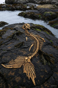 The colossal scale of the unearthed being—its vast skeletal arches, impossible musculature, and the uncanny convergence of marine and humanoid architecture—forces even the most seasoned researchers to confront the unthinkable. In this speculative account, the creature’s existence destabilizes every foundation of conventional biology. Its rib structures resemble those of deep-sea leviathans, yet its cranial symmetry mirrors that of early hominids, as if nature itself attempted a forbidden experiment in the abyssal dark.